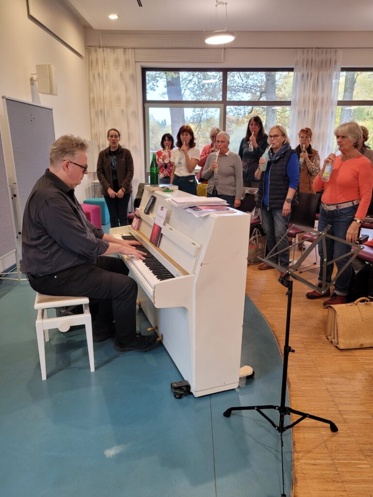 Wir überraschten unseren Chorleiter Rainer mit einer kleinen Feier zu seinem 30-jährigen „Dienstjubiläum“. Einige Chormitglieder waren kreativ und haben zu diesem Anlass ein Lied umgedichtet und personalisiert. Es gab ein paar Knabbereien und ein Glas Sekt durfte natürlich auch nicht fehlen.